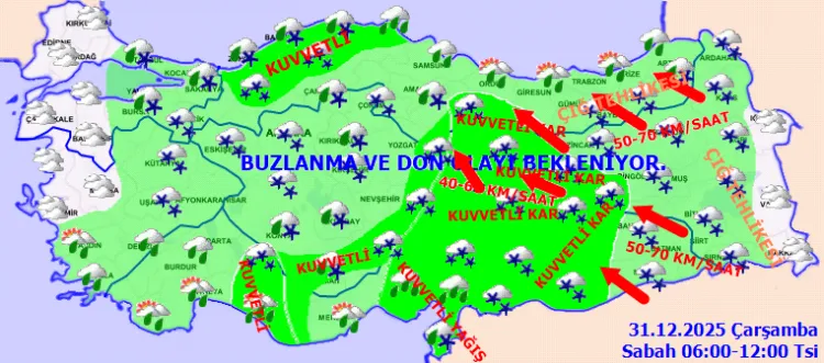 Meteoroloji Genel Müdürlüğü, 2025'in son günü ve yeni yılın ilk gününde Türkiye genelinde soğuk ve yağışlı havanın etkili olacağını duyurdu. Yurt genelinde soğuyan hava ile birlikte kuvvetli yağış, fırtına, buzlanma ve çığ tehlikesine dikkat!