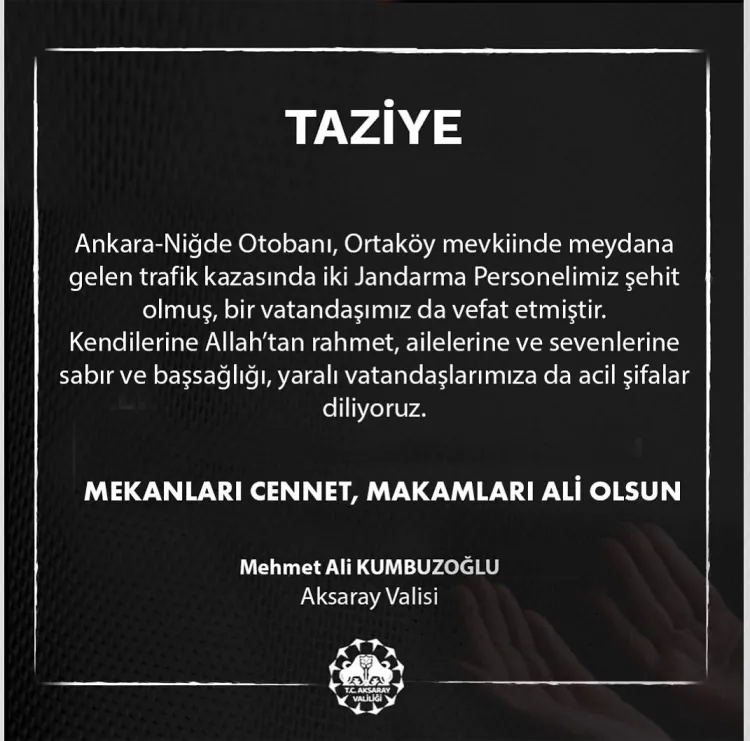 Ankara-Niğde Otoyolu Ortaköy mevkiinde meydana gelen trafik kazasında 2 jandarma personeli şehit oldu, 1 vatandaş hayatını kaybetti. Aksaray Valisi Mehmet Ali Kumbuzoğlu ve Milli Savunma Bakanlığı başsağlığı mesajı yayımladı.