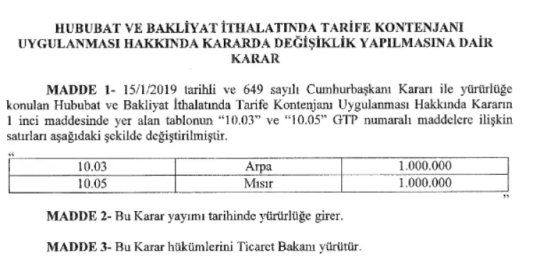 Bugünkü Resmi Gazete'de yayımlanan Cumhurbaşkanı Kararı ile hububat ve bakliyat ithalatında tarife kontenjanları güncellendi. Arpa ve mısır ithalatında tarife kontenjanları 1 milyon tona yükseltildi.