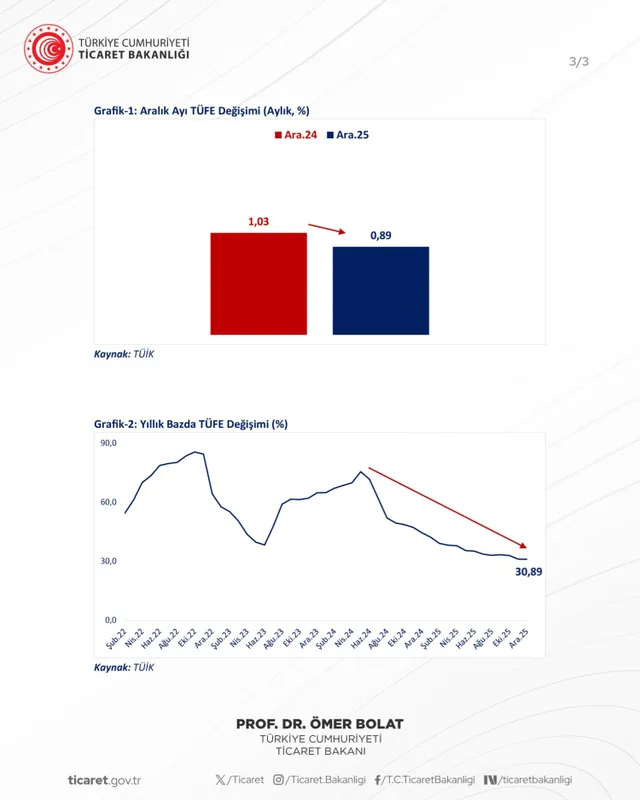 Ticaret Bakanı Ömer Bolat, Aralık 2025'te yıllık enflasyonun yüzde 30,89'a gerilediğini açıkladı. Bakan, düşüşün Türkiye ekonomisindeki toparlanma ve dezenflasyon sürecinin başarılı bir şekilde sürdüğünü gösterdiğini belirtti.