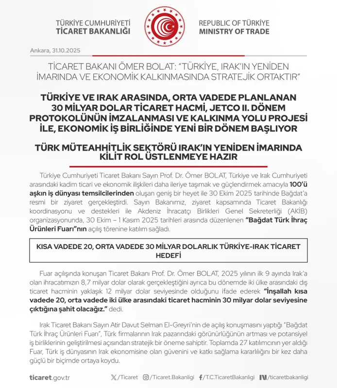 2024'te 17,5 milyar dolar olan hacmin kısa vadede 20 milyara, orta vadede 30 milyar dolara çıkarılmasının planladığını kaydeden Bakan Bolat, "2025'in 9 ayında ihracat 8,7 milyar dolar, toplam ticaret 12 milyar dolar seviyesinde. Irak'ı Türkiye üzerinden Avrupa'ya bağlayacak vizyon proje Kalkınma Yolu Projesi ise Türkiye aktif rol alacak" dedi .