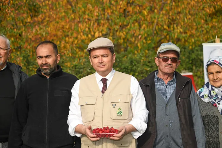 Osmangazi Belediye Başkanı Erkan Aydın, daha sonra ahududuları toplayarak, emeği geçen çiftçilerle hatıra fotoğrafı çektirdi.