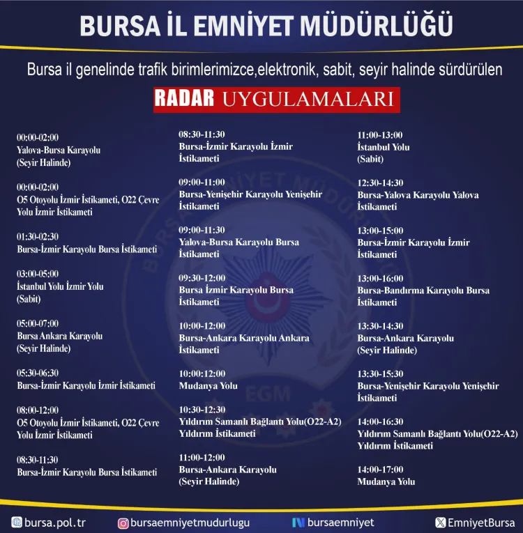 BURSA (İGFA) - Bursa Emniyet Müdürlüğü'nün sosyal medya hesabından yapılan paylaşımda, il genelinde 10 Ekim Cuma (bugün) yapılacak elektronik, sabit ve seyir halinde radar denetimlerinde hız ihlallerine ilişkin planlı kontrollerin saatleri ve yerleri açıklandı.