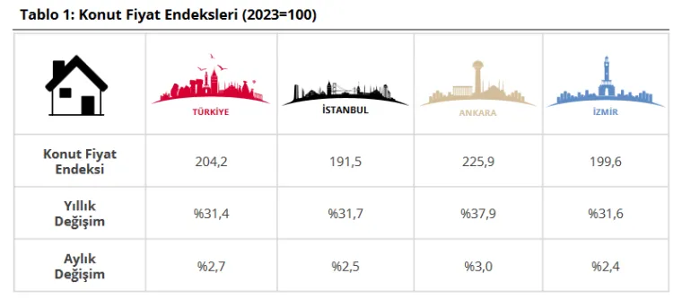 İstanbul, Ankara ve İzmir'de Kasım ayındaki fiyat değişimleri sırasıyla yüzde 2,5, 3,0 ve 2,4 olarak kaydedildi. Geçen yılın aynı ayına göre ise İstanbul'da yüzde 31,7, Ankara'da yüzde 37,9 ve İzmir'de yüzde 31,6 oranlarında artış görüldü.