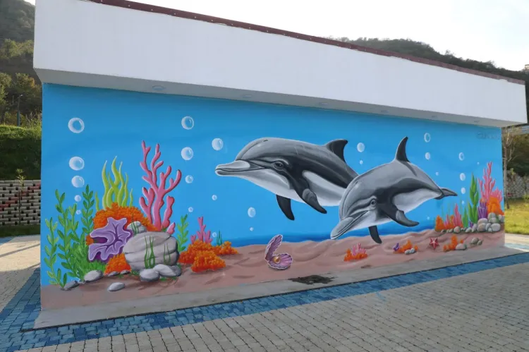 Gülyalı Mavi Dünya Plajı'nda engelli vatandaşlar için özel olarak tasarlanan tesisin dış cephesi, neşeli ve motive edici bir mural çalışmasıyla renklendirildi.