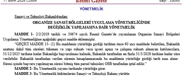 Yeni eklenen Geçici Madde 13 kapsamında; bugünden önce, OSB Uygulama Yönetmeliği'nin 60. maddesinde belirtilen ve Bakanlıkça yapılan uzatmalar da dahil olmak üzere tüm süreleri sona eren katılımcılar, 31 Aralık 2025 tarihine kadar Sanayi ve Teknoloji Bakanlığı'na başvurmaları halinde, kendilerine en fazla 31 Mart 2028 tarihine kadar süre verilebilecek.