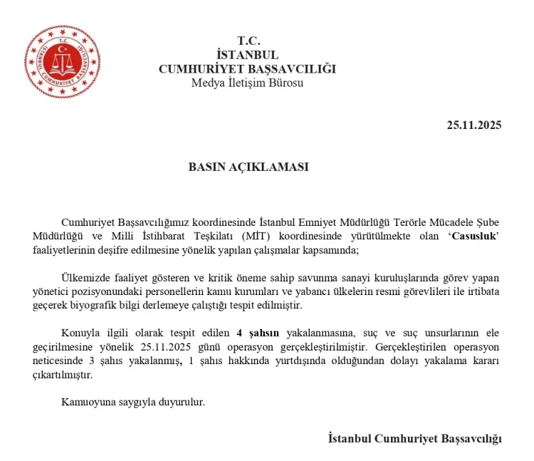 İstanbul Cumhuriyet Başsavcılığı'nın koordinasyonunda yürütülen soruşturmada, kritik savunma sanayi kuruluşlarında görevli yöneticilerin yabancı ülke görevlileriyle irtibat kurarak biyografik bilgi toplamaya çalıştıkları tespit edildi. Operasyonda 3 kişi gözaltına alınırken, yurtdışındaki 1 şüpheli için yakalama kararı çıkarıldı.