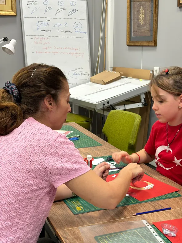 "Bayrağımız Çiçek Açsın" ismini taşıyan Katı'ı Atölyesi'nde, Osmanlı döneminde önemli eserler verilen kâğıt oymacılığı sanatı üzerine bilgilendirme yapıldı. Ardından çocuklar, ay yıldızlı bayrağımızın motiflerini işleyerek kendi eserlerini hazırladı. Eğitmenlerin rehberliğinde yürütülen uygulamada çocuklar, hem el becerilerini geliştirdi hem de Cumhuriyet sevgisini sanata dönüştürmenin gururunu yaşadı. Benzer şekilde Tezhip Atölyesi'nde de Türk Bayrağı teması işlendi ve çocuklar zarif desenlerle süslenmiş eserler ortaya koydu.