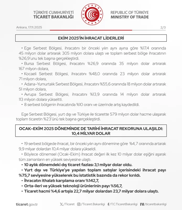Ocak–Ekim 2025 döneminde ise 19 serbest bölgede ihracat, yüzde 4,7 artışla 10,4 milyar dolara çıkarak tüm zamanların en yüksek dönemsel değerine ulaştı. Dış ticaret fazlası 3,1 milyar dolar olurken, ihracatın ithalatı karşılama oranı yüzde 142,7'ye yükseldi. Orta ve yüksek teknoloji ürünlerinin payı yüzde 56,7 seviyesinde gerçekleşti.