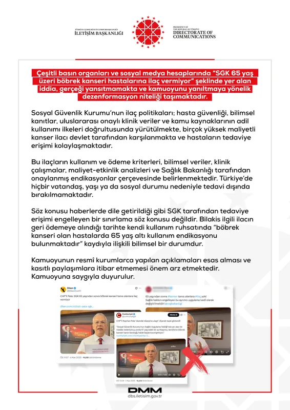 Sosyal Güvenlik Kurumu, bazı basın ve sosyal medya paylaşımlarındaki iddiaların dezenformasyon niteliği taşıdığını açıkladı. SGK ile ilgili '65 yaş üzeri böbrek kanseri hastalarına ilaç verilmiyor' iddiasını yalanlama İletişim Başkanlığı Dezenformasyonla Mücadele Merkezi'nden geldi.