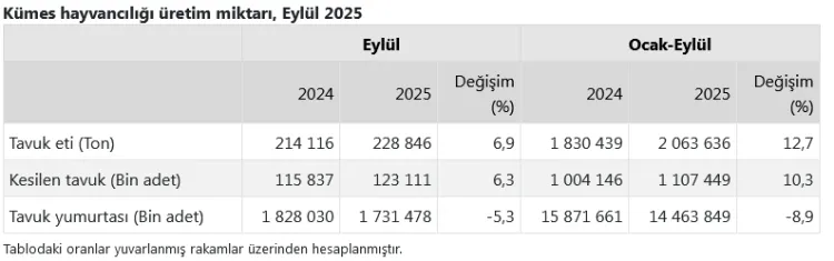 TÜİK verilerine göre, Eylül ayında tavuk eti üretimi 228 bin 846 ton, tavuk yumurtası üretimi ise 1 milyar 731 milyon 478 bin adet olarak gerçekleşti. Tavuk eti üretimi yıllık bazda artarken, yumurta üretimi azaldı.