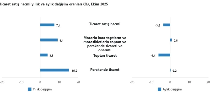 Türkiye İstatistik Kurumu (TÜİK) verilerine göre, ticaret satış hacmi (2021=100) 2025 yılı Ekim ayında bir önceki yılın aynı ayına göre yüzde 7,4 artış gösterdi.