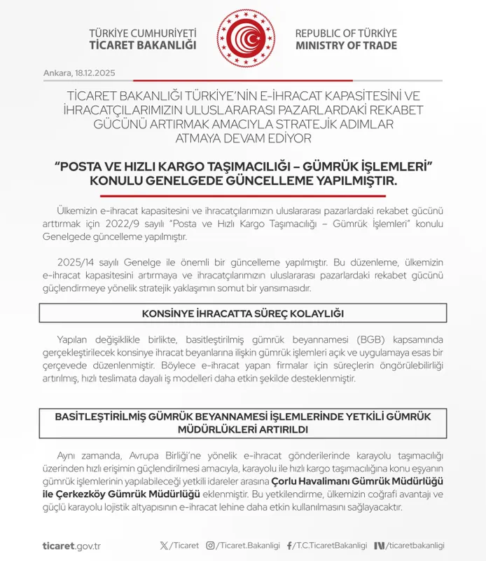 Ticaret Bakanlığı, e-ihracat kapasitesini artırmak ve ihracatçının uluslararası pazarlarda rekabet gücünü güçlendirmek için 2025/14 sayılı "Posta ve Hızlı Kargo Taşımacılığı – Gümrük İşlemleri" Genelgesi'nde güncellemeler yaptı. Düzenlemeyle konsinye ihracat ve basitleştirilmiş gümrük işlemleri daha hızlı ve öngörülebilir hâle getirildi.