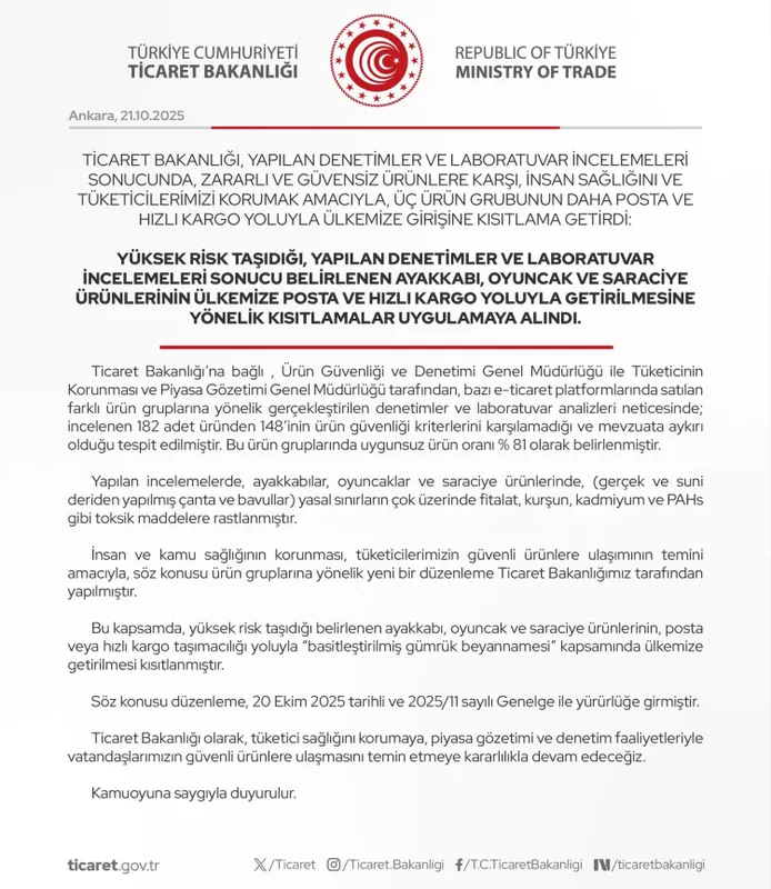 Bakanlıktan yapılan açıklamada, 20 Ekim 2025 tarihli ve 2025/11 sayılı Genelge ile, yüksek risk taşıyan bu ürünlerin "basitleştirilmiş gümrük beyannamesi" kapsamında posta ya da hızlı kargo yoluyla ülkeye girişleri kısıtlandı. Açıklamada, vatandaşların güvenli ürünlere ulaşması ve sağlığın korunması adına denetim faaliyetlerinin artarak süreceği vurgulanırken, "Ticaret Bakanlığı olarak, tüketici sağlığını korumaya, piyasa gözetimi ve denetim faaliyetleriyle vatandaşlarımızın güvenli ürünlere ulaşmasını temin etmeye kararlılıkla devam edeceğiz." ifadeleri yer aldı.