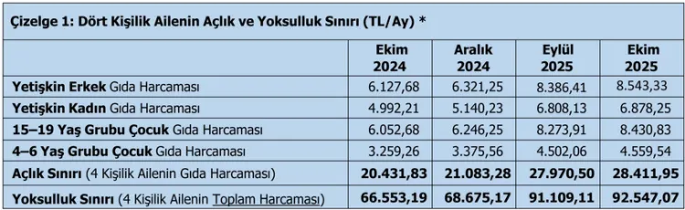 TÜRK-İŞ'in Ekim 2025 araştırmasına göre, dört kişilik bir ailenin açlık sınırı 28 bin lirayı, yoksulluk sınırı ise 92 bin lirayı aştı. Bekâr bir çalışanın yaşama maliyeti 36 bin 984 TL'ye yükselirken, mutfak enflasyonu aylık yüzde 1,58 arttı.