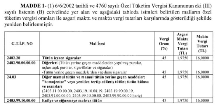 Tütün ürünlerinde yüzde 45'lik ÖTV oranı korunurken, asgari maktu ve maktu tutarlar artırıldı. Bu değişiklikler, tütün mamullerinin satış fiyatlarına zam olarak yansıyacak.