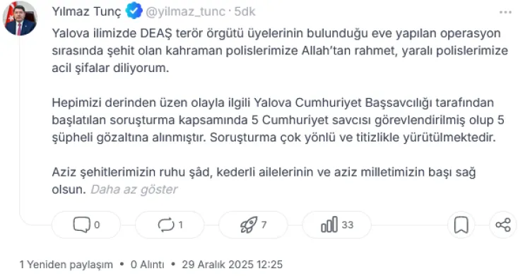 Adalet Bakanı Yılmaz Tunç, Yalova'da DEAŞ'a yönelik operasyonda şehit olan polisler için başsağlığı dilerken, olayla ilgili başlatılan soruşturmada 5 şüphelinin gözaltına alındığını açıkladı. Bakan Tunç, soruşturma kapsamında 5 Cumhuriyet Savcısı'nın görevlendirildiğini duyurdu.