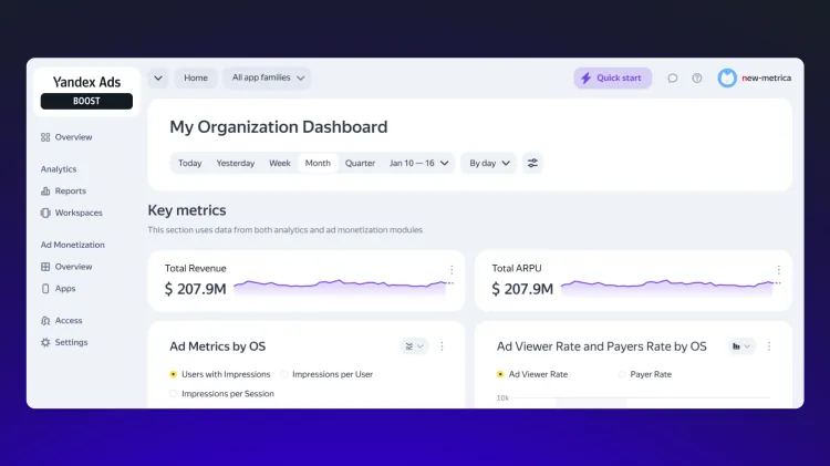 İSTANBUL (İGFA) - Yandex Ads Boost; geliştiricilere küresel reklam ağı, bütünleşik analiz araçları, kullanıcı kazanımı ve uygulama içi para kazanma gibi temel bileşenleri bir arada sunuyor. Sistem, 600 binden fazla reklamvereni ve 60 DSP (talep tarafı platformu) iş ortağını bünyesinde barındırıyor.