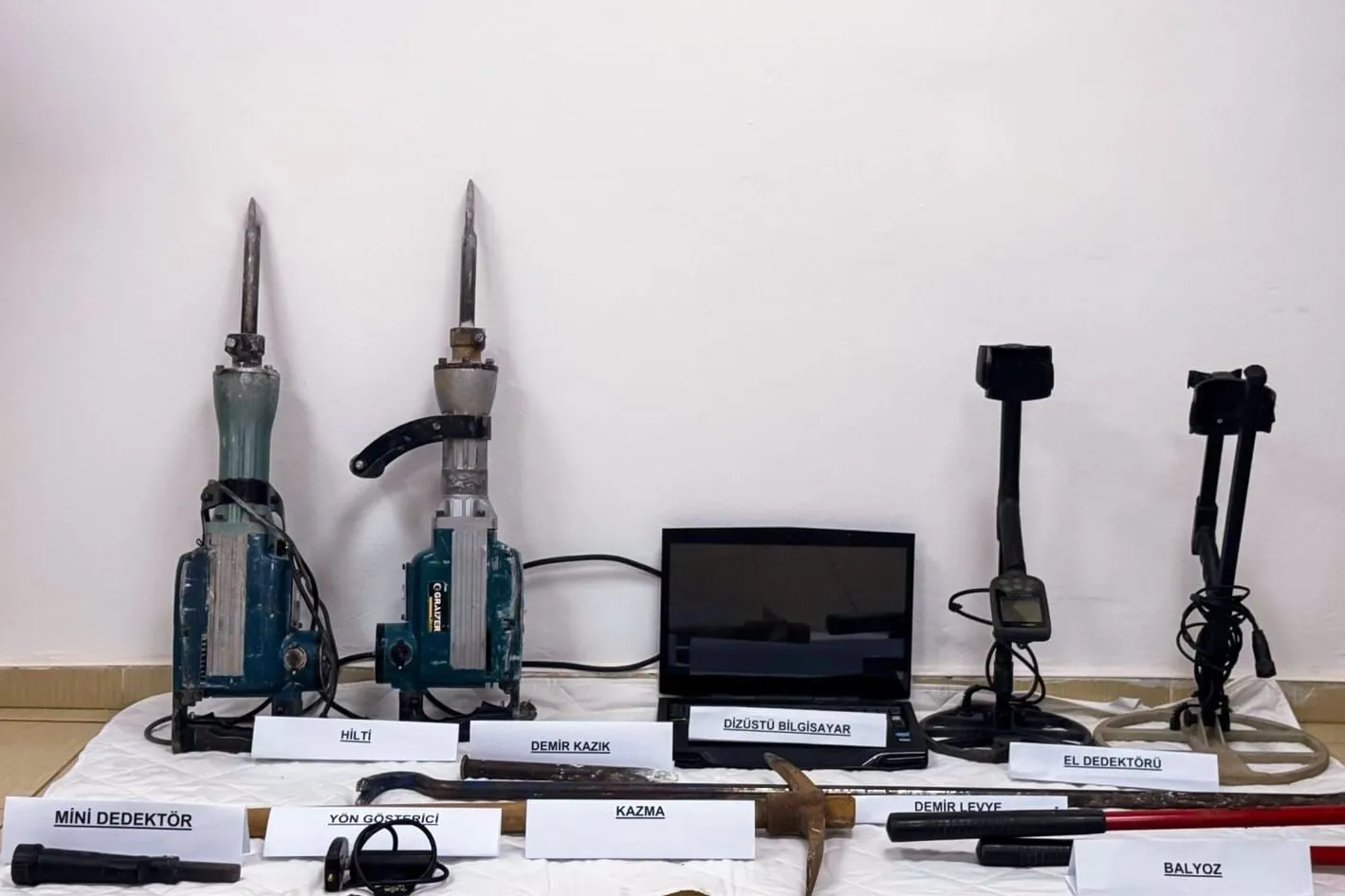 Operasyonda 2 adet el dedektörü, 1 adet mini dedektör, 1 adet yön gösterici, 1 adet dizüstü bilgisayar, 2 adet hilti ve çok sayıda kazı malzemesi ele geçirildi.