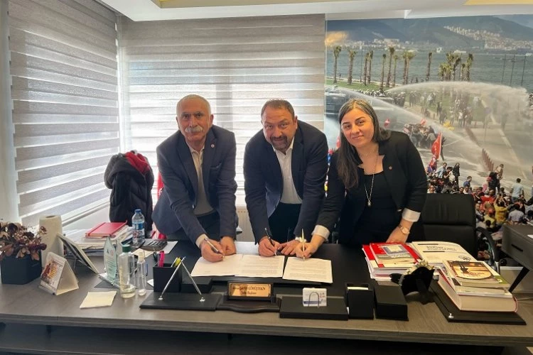 İZMİR (İGFA) - Çiğli Belediyesi şirketi ÇİBEL ile DİSK Ege Bölge Temsilcisi Memiş Sarı, iş yerinde örgütlü sendika DİSK Genel-İş İzmir 8 No’lu Şube Başkanı Deniz Şahin Gümüştekin, yönetimi ve temsilcilerin katılımı ile ek protokol imzalandı. 2022 yılında 3 yıllık sözleşmeye imza atılmış ve buna göre birinci yıl yüzde 36, ikinci yılın ilk altı ayında yüzde 20, ikinci altı ayında ise yüzde 17 zam oranında anlaşılmıştı. Ancak yaşanan olumsuz ekonomik koşullar sonrası ek protokol imzalanarak ikinci altı ayda yüzde 17 olan zam oranı yüzde 35 olarak gerçekleştirilmişti. Üçüncü yılda da (TEFE+ÜFE)/2+2oranında zam hususunda anlaşma sağlanarak, yüzde 56, 27 oranında zam yapılmıştı. Ancak enflasyonun yüzde 64,77 olarak açıklanmasının ardından Çiğli Belediye Başkanı Gümrükçü’den işçilere ek zam müjdesi geldi.