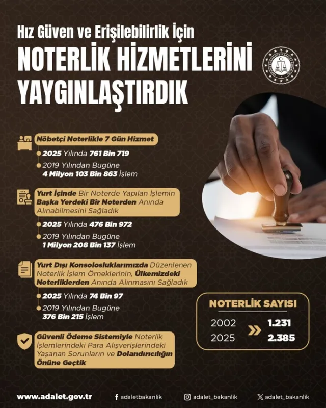 ANKARA (İGFA) - Adalet Bakanı Yılmaz Tunç, noterlik hizmetlerine ilişkin 2025 yılı verilerini paylaştı.