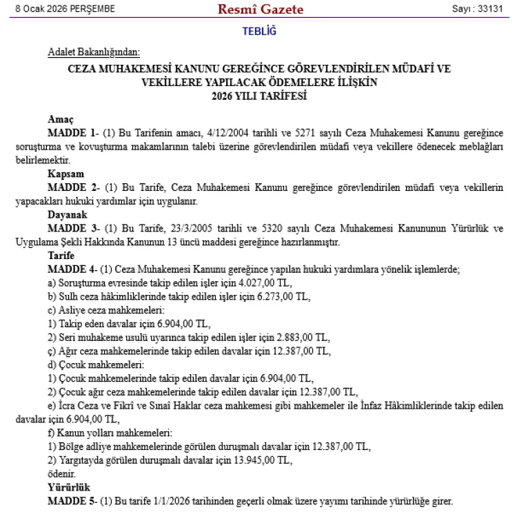 Adalet Bakanlığı, Ceza Muhakemesi Kanunu gereğince görevlendirilen müdafi ve vekillere ödenecek ücretleri Resmi Gazete'de yayımlanan tarife ile açıkladı.