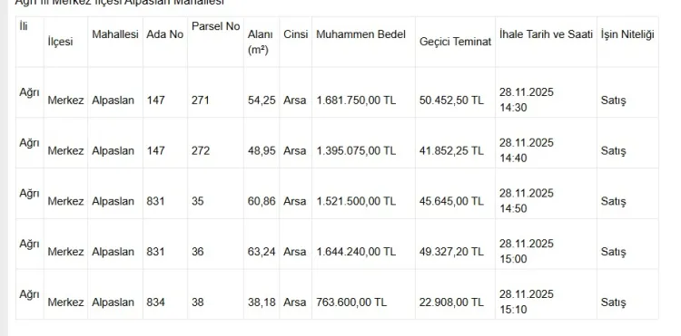 Toplam muhammen bedeli yaklaşık 7 milyon TL olan arsaların satış ihalesi 28 Kasım 2025 tarihinde yapılacak.
