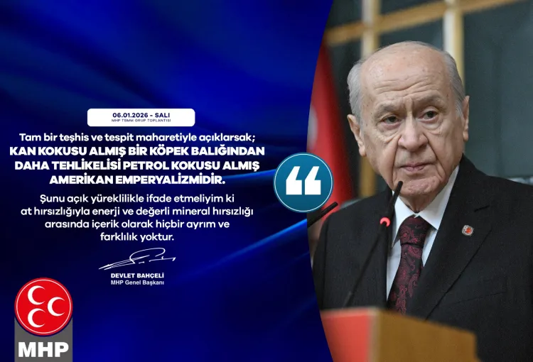 ABD'nin asıl hedefinin Venezuela'nın enerji kaynakları olduğunu savunan Bahçeli, "Petrol kokusu almış Amerikan emperyalizmi her türlü hukuksuzluğu mubah görmektedir" ifadelerini kullandı. ABD Başkanı Donald Trump'ın politikalarını da sert sözlerle eleştiren Bahçeli, Venezuela'nın kaderinin yalnızca Venezuela halkı tarafından belirlenmesi gerektiğini vurguladı.