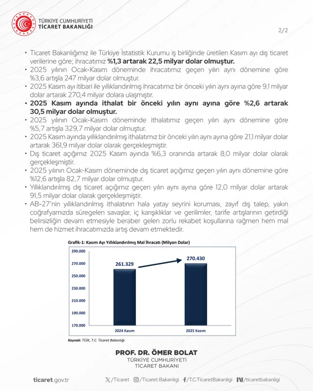 Ticaret Bakanı Prof. Dr. Ömer Bolat, Ticaret Bakanlığı'nın 31 Aralık 2025 tarihinde yaptığı resmi paylaşımda, Kasım 2025 dış ticaret verilerini değerlendirdi. Bakan Bolat, olumsuz takvim etkisine rağmen ihracatta artış kaydedildiğini vurgulayarak, Türkiye ekonomisinin dirençli performansını öne çıkardığını söyledi.