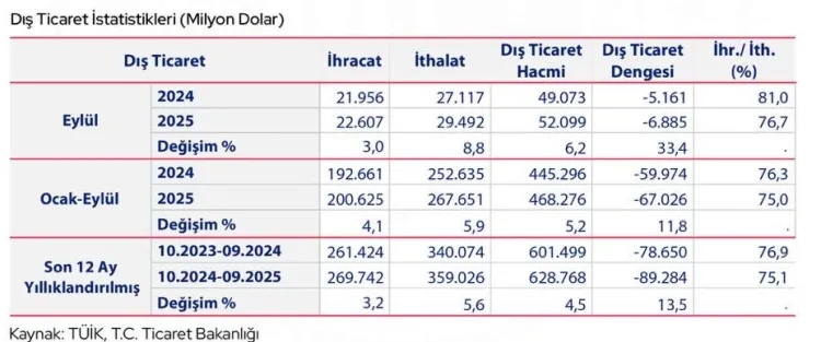 Ticaret Bakanı Ömer Bolat, 2025 Eylül ayı dış ticaret verilerini açıklayarak, Türkiye'nin küresel rekabete rağmen 390 milyar dolarlık mal ve hizmet ihracat hedefine ulaştığını duyurdu. İlk 9 ayda mal ihracatı 8 milyar dolar, hizmet ihracatı 3,2 milyar dolar arttı. Bolat, "Aralık'ta hedefi aşacağız" dedi.