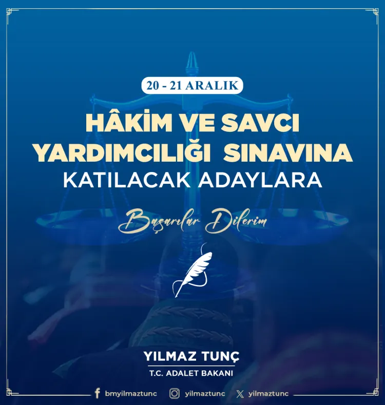 Tunç paylaşımında, adaylara başarı dileklerini iletirken, "Adaletin tecellisi yolunda hayallerindeki mesleğe kavuşmak için sınavda ter dökecek tüm adaylarımıza başarılar diliyorum. Emeklerinin karşılığını almalarını temenni ediyorum. Allah zihin açıklığı versin" ifadelerine yer verdi.