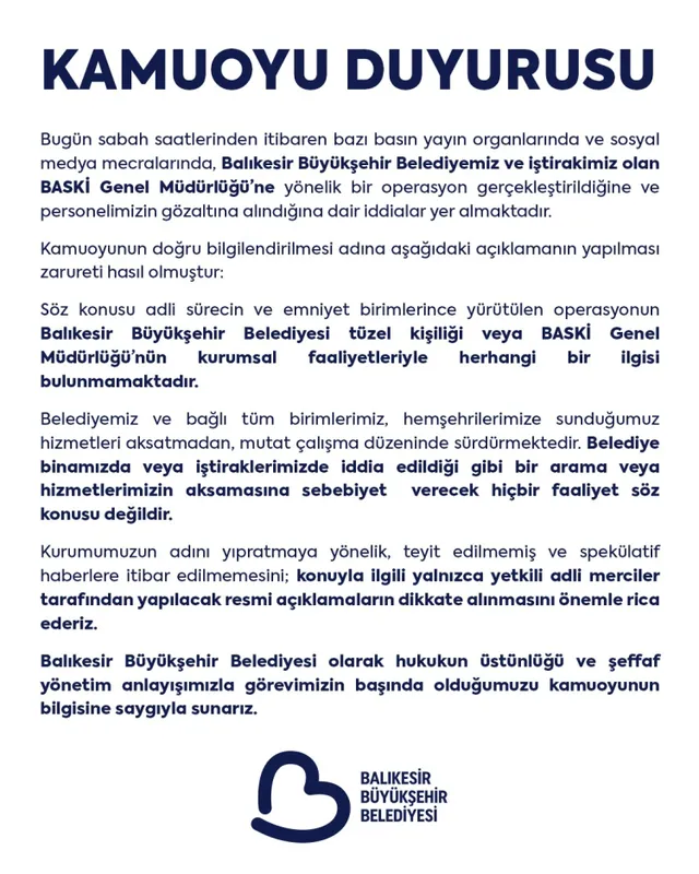 Belediyenin kamuoyu duyurusunda, "Söz konusu adli sürecin ve emniyet birimlerince yürütülen operasyonun Balıkesir Büyükşehir Belediyesi tüzel kişiliği veya BASKİ Genel Müdürlüğü'nün kurumsal faaliyetleriyle herhangi bir ilgisi bulunmamaktadır." denildi.