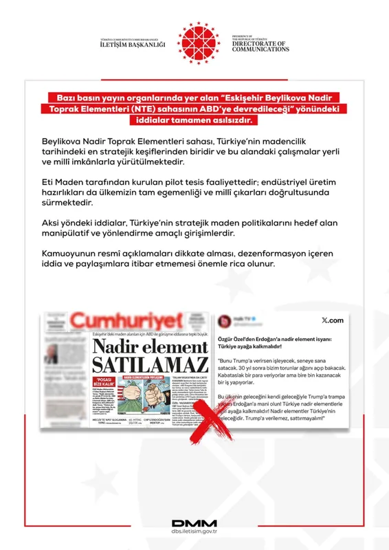 Eskişehir'deki Nadir Toprak Elementleri sahasının ABD'ye devredileceği yönündeki iddialar gerçeği yansıtmıyor. Cumhurbaşkanlığı İletişim Başkanlığı, "manipülatif ve yönlendirme amaçlı" bu paylaşımlara itibar edilmemesi uyarısında bulundu.