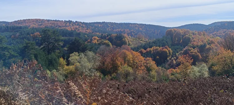 Bilecik'in doğa cenneti Pazaryeri ilçesi, sonbaharın gelişiyle birlikte adeta kartpostallık manzaralarla kaplandı. İlçeye bağlı Bozcaarmut köyü yakınlarındaki ormanlık alanlarda, kayın, çam ve meşe ağaçlarının renk değişimiyle oluşan büyüleyici manzara görenleri hayran bıraktı.