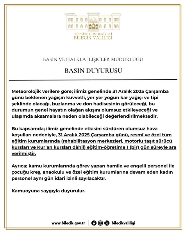 Bilecik Valisi Faik Oktay Sözer, olumsuz hava koşulları nedeniyle 31 Aralık 2025 Çarşamba günü il genelinde eğitime ara verildiğini duyurdu.