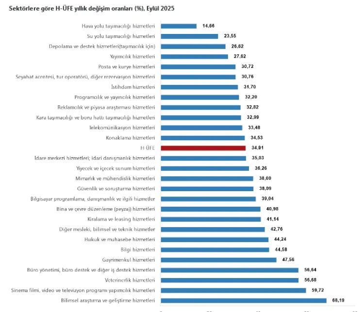 Türkiye İstatistik Kurumu (TÜİK), 2025 yılı Eylül ayı Hizmet Üretici Fiyat Endeksi (H-ÜFE) sonuçlarını açıkladı. H-ÜFE Eylül'de yıllık yüzde 34,91 artık. Yıllık değişimde en çok değişim bilimsel araştırma ve geliştirme hizmetlerinde olurken, aylık bazda en çok değişim programcılık ve yayıncılık hizmetlerinde oldu.