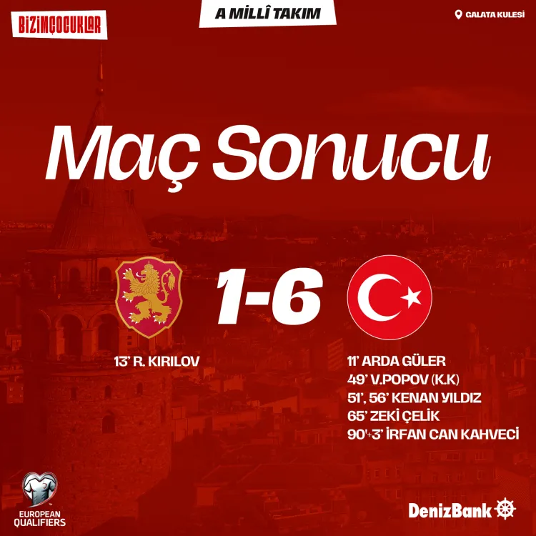 A Milli Futbol Takımı, 2026 FIFA Dünya Kupası Avrupa Elemeleri'nde deplasmanda Bulgaristan'ı 6-1'lik tarihi bir skorla mağlup ederek büyük bir başarıya imza attı. Gençlik ve Spor Bakanı Osman Aşkın Bak, "Yolumuza emin adımlarla devam ediyoruz! Tebrikler #BizimÇocuklar!" mesajıyla takımı kutladı. Sosyal medyada da tebrik mesajları yağmur gibi yağdı.