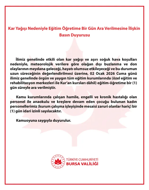 Bursa Valiliği, etkisini artıran yoğun kar yağışı ve olumsuz hava koşulları nedeniyle il genelinde eğitim ve öğretime 2 Ocak Cuma günü bir gün süreyle ara verildiğini duyurdu.