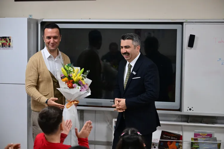 Ders başladıktan sonra, kapıyı vurarak elindeki çiçekle sınıfa giren Başkan Yılmaz, öğretmen Gürkan Gökbudak ve öğrencilerine sürpriz yaptı.