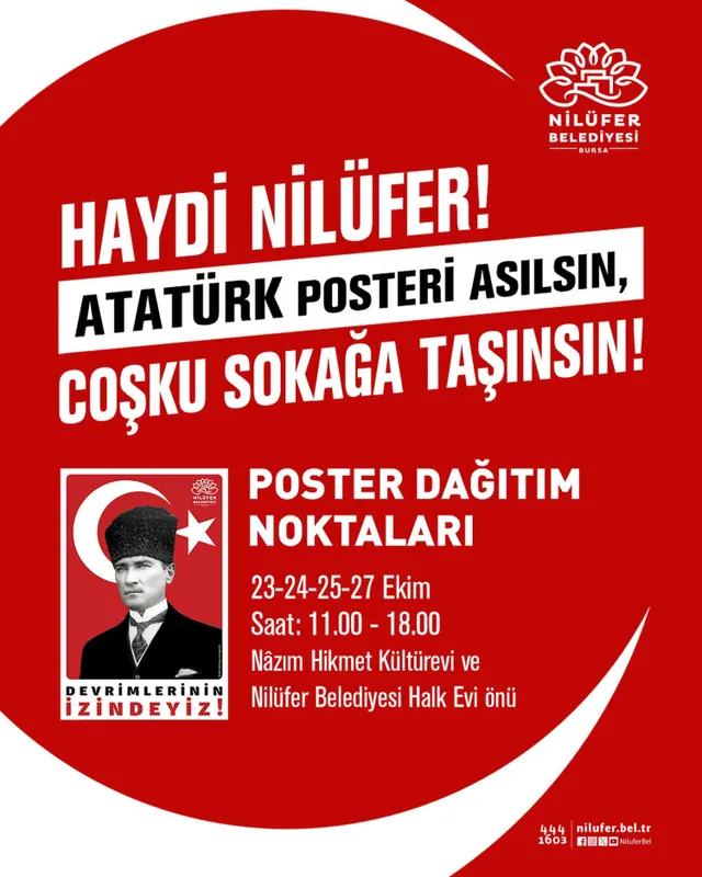 Nilüfer Belediyesi, bu bayramda da geleneği bozmayarak binlerce Atatürk posterini vatandaşlarla buluşturacak. Ulu Önder'in posterleri, 23, 24, 25 ve 27 Ekim tarihlerinde Nilüfer Belediyesi Halk Evi önü ve Nazım Hikmet Kültürevi'nden ücretsiz olarak temin edilebilecek.