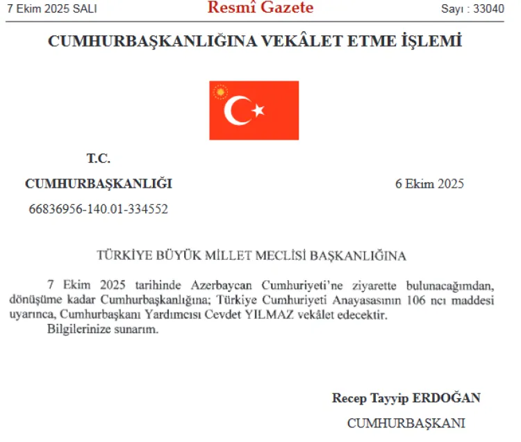 Buna göre Cumhurbaşkanı Erdoğan'ın Azerbaycan Cumhuriyeti'nden dönüşüne kadar yerine Cumhurbaşkanı Yardımcısı Cevdet Yılmaz'ın vekalet edeceği bildirildi.