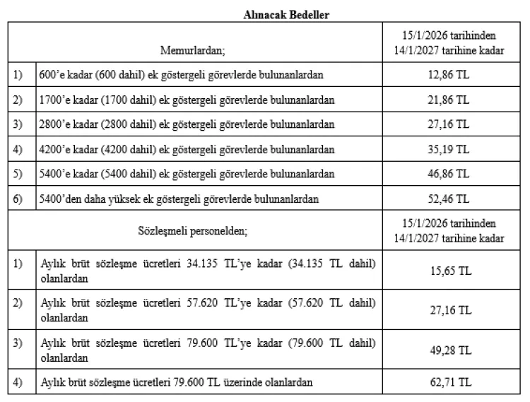 Memurlar için günlük asgari yemek bedelleri, ek göstergeye göre 12,86 TL ile 52,46 TL arasında değişirken; sözleşmeli personel için günlük yemek bedeli, brüt sözleşme ücretine göre 15,65 TL'den başlayıp 62,71 TL'ye kadar yükseliyor.