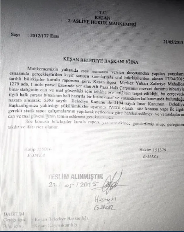 2.Asliye Hukuk Mahkemesi'nce 21 Mayıs 2015 tarihli 22 Mayıs 2015 ve 11 Eylül 2019 tarihinde Keşan Kaymakamlığı ve Keşan Belediye Başkanlığı'na gönderilen 2012/177 Esas Nolu Kararın içeriği şöyle: Mahkememizin yukarıda esas numarası verilen dosyasından yapılan yargılama esnasında gerçekleştirilen keşif sonucu konularında bilirkişilerden alınan 17.4.2015 tarihli bilirkişi kurulu raporuna göre; Keşan ilçesi merkez Yukarı Zaferiye Mahallesi 1279 nolu Ada 1 nolu parselin üzerinde yer alan Ali Paşa Halk Çarşısı'nın mevcut durumu itibariyle bina statiğinin can ve mal güvenliği için tehlike arz ettiği tespit edildi. Bu çerçevede ilgili halk çarşısı binasının halihazırda bir kısım esnaf ve vatandaşın kullanımında bulunduğu nazarı alınarak 5393 sayılı Belediye kanunu ile 3194 sayılı imar kanunun belediye başkanlığınıza yüklediği yükümlülükler uyarınca ivedi olarak söz konusu yapı ile ilgili gerekli statik rapor çalışmalarının yapılarak neticesine göre hareket edilmesi ve vatandaşların can ve mal güvenliğini temin edilmesi gerekmektedir. Söz konusu bilirkişi kurulu raporu yazımız ekinde gönderilmiş olup gereğini takdir ve ifası rica olunur.