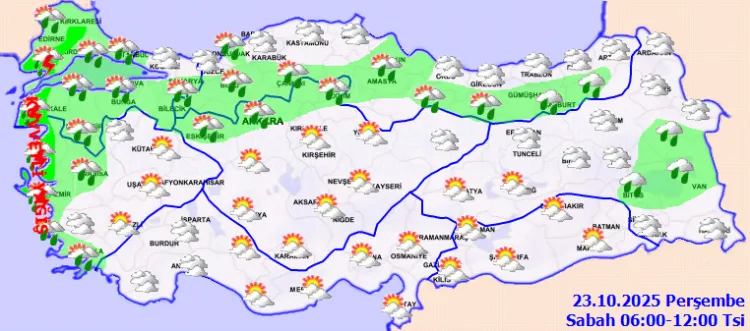 Marmara, Ege, Batı Akdeniz, Doğu Akdeniz'in Toroslar kesimi, Batı ve Orta Karadeniz, Doğu Karadeniz'in iç kesimleri, Doğu Anadolu'nun kuzey ve batısı ile Eskişehir, Ankara, Çankırı, Sivas, Çorum, Bitlis ve Van çevrelerinde yağmur ve sağanak yağış bekleniyor.