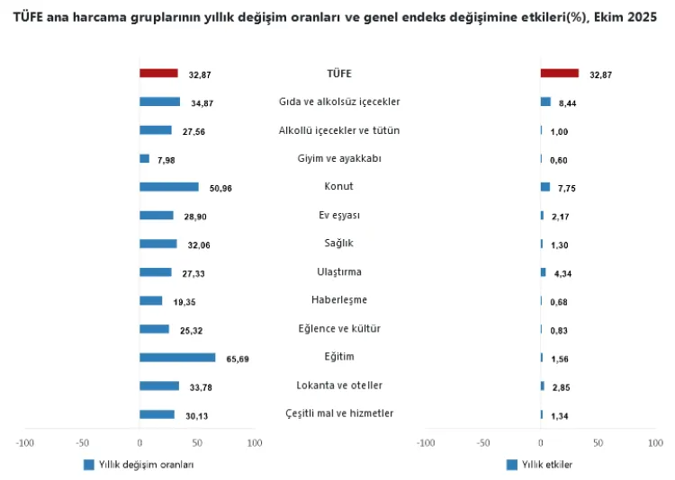 TÜİK, Ekim ayına ilişkin Tüketici Fiyat Endeksi (TÜFE) verilerini açıkladı. Buna göre Ekim ayında enflasyon yüzde 2,55 olarak gerçekleşirken, yıllık enflasyon ise yüzde 32.87 oldu. Yıllık enflasyonda gıda yüzde 34,87, konut ise yüzde 50,96 ile rekor kırdı.