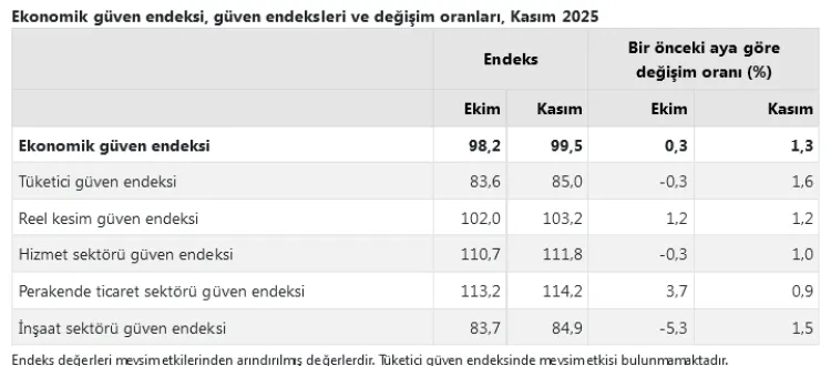 Ekim ayında 98,2 olan ekonomik güven endeksi, Kasım'da yüzde 1,3'lük artışla 99,5 seviyesine çıktı. Tüm alt endekslerde yükseliş görüldü. Veriler, Kasım ayında ekonominin genelinde sınırlı ancak yaygın bir iyileşmeye işaret etti.