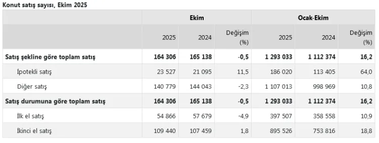 TÜİK verilerine göre Türkiye genelinde konut satışları Ekim ayında geçen yılın aynı ayına göre yüzde 0,5 azalarak 164 bin 306 oldu. En fazla satış İstanbul'da, en az satış ise Ardahan'da gerçekleşti. Yabancıya en çok konut satışı 729 ile Antalya, 725 ile İstanbul ve 192 ile Mersin illerinde gerçekleşti.