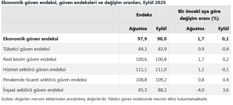 Türkiye İstatistik Kurumu (TÜİK), Eylül ayında ilişkin ekonomik güven endeksini 0,1 artışla 98 olarak açıkladı. Tüketici ile hizmet sektörü güven endeksleri geriledi.