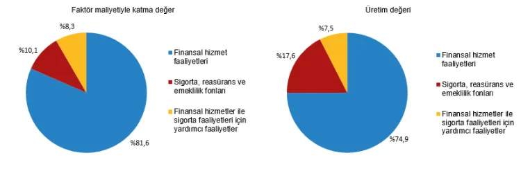 Faktör maliyetiyle katma değer 1 trilyon 734 milyar TL, üretim değeri ise 2 trilyon 882 milyar TL olarak gerçekleşti. Katma değerin yüzde 81,6'sı finansal hizmetlerde, yüzde 10,1'i sigorta-reasürans-emeklilik fonlarında, yüzde 8,3'ü yardımcı faaliyetlerde oluştu.