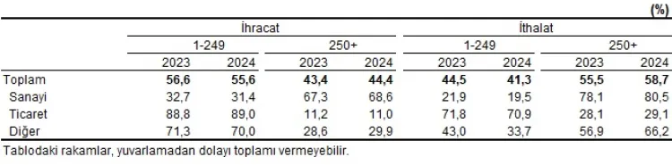Verilere göre, 179 bin 673 girişim ihracat, 318 bin 603 girişim ithalat yaptı. Eşleştirmede girişimlerin yüzde 100'üne ulaşıldı; ithalattaki girişim artışı, Basitleştirilmiş Gümrük Beyannamesi sisteminden kaynaklandı.Girişim Ölçeklerine Göre Dağılım İhracat: Mikro (1-9 çalışan) girişimler yüzde 75,6'sını oluşturup yüzde 18,8 pay aldı. Küçük (10-49) yüzde 17,5, orta (50-249) yüzde 19,2, büyük (250+) yüzde 44,4 paya sahip.